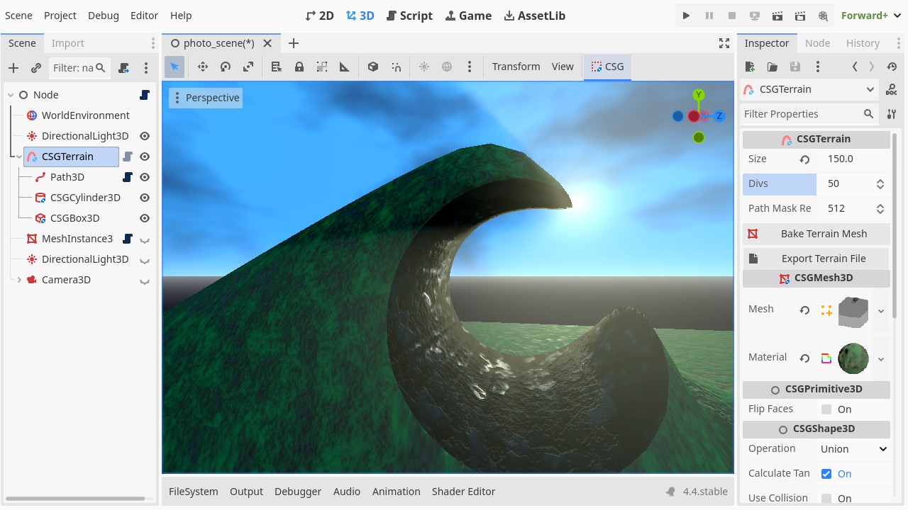 Unlike brush-based systems, CSG Terrain shapes geometry by following paths. Developers place or duplicate Path3D nodes, adjust their parameters, and the terrain updates automatically. Terrains can then be baked into MeshInstance3D for LightmapGI or exported as glTF for refinement in external software such as Blender.