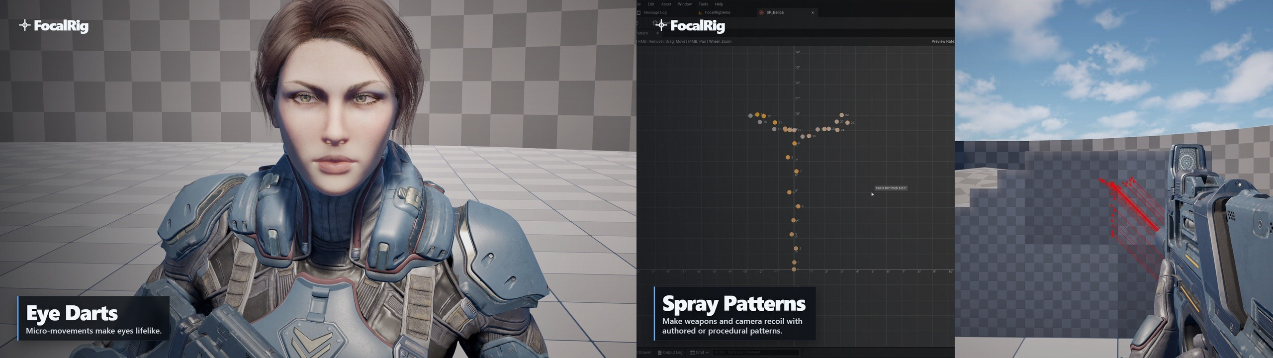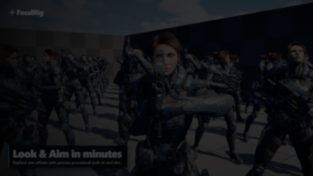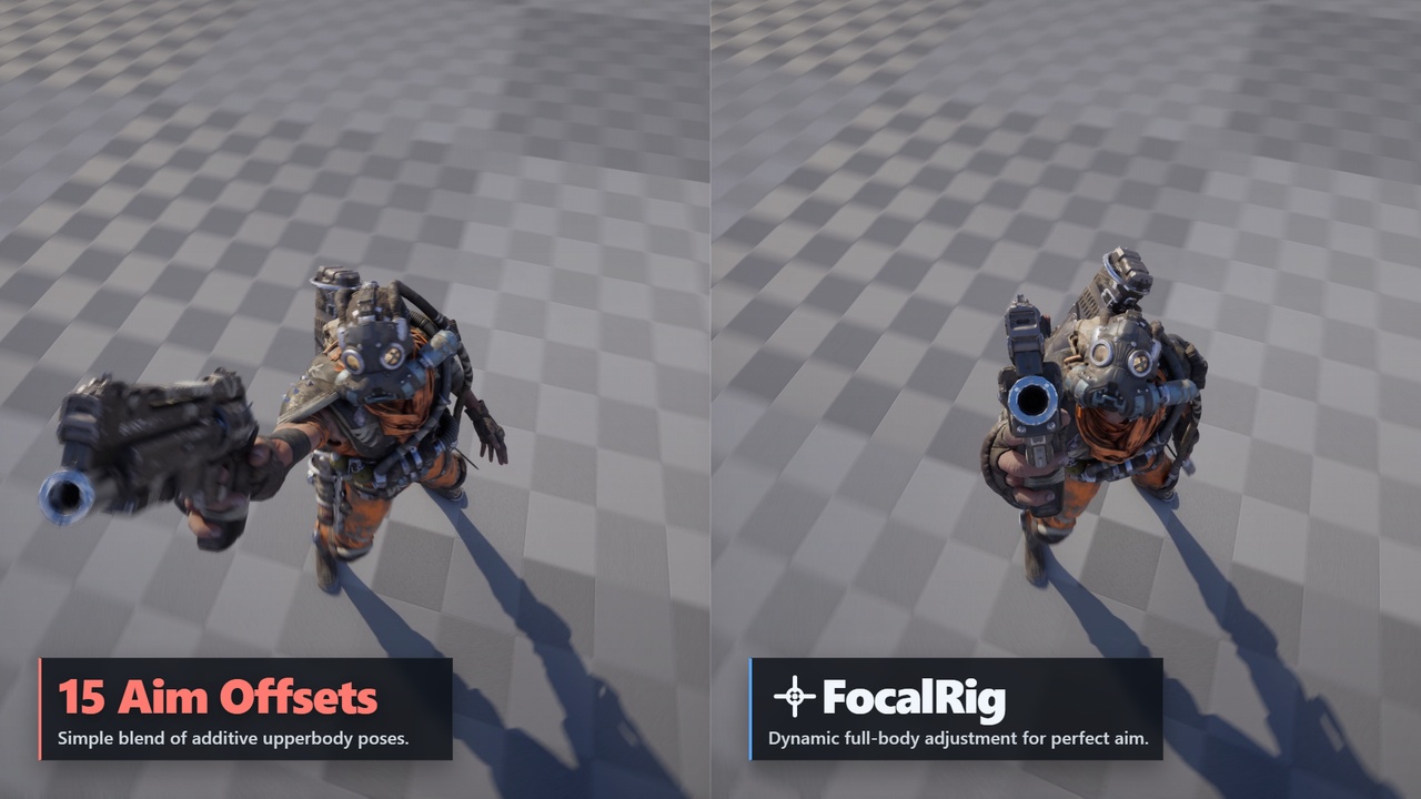 FocalRig works by defining a target and adjusting the relevant bone chains so elements like the head or weapon stay aligned with it. Because this happens at the rig level, the result stays consistent even as the base pose changes.