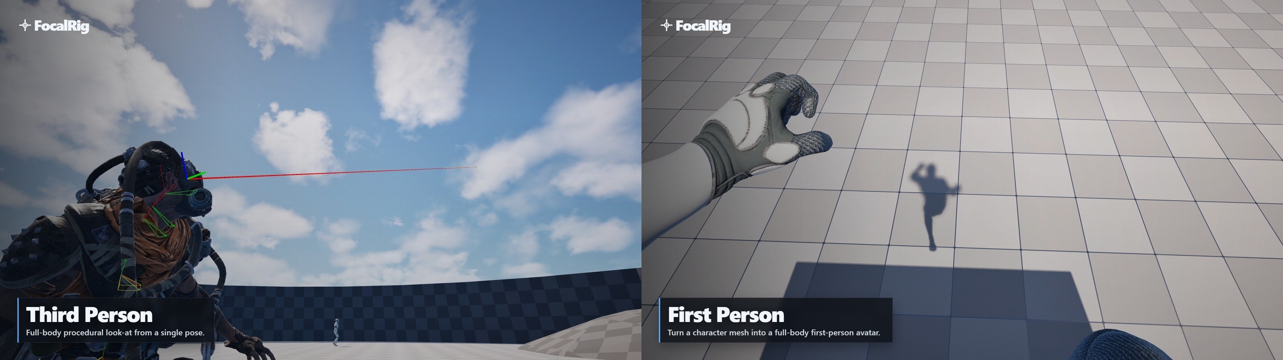 The system supports both third-person characters and full-body first-person rigs.