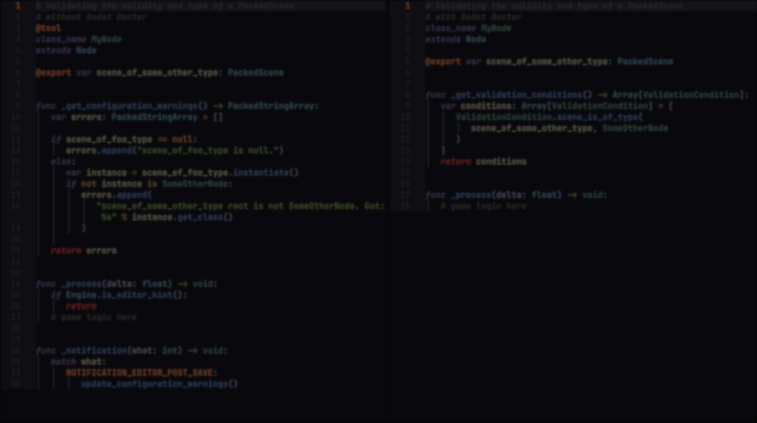 Differences: Godot Doctor validates scene structure and inspector values as well as resources before runtime, whereas Godot GDScript Linter focuses solely on code quality and style issues. The linter is more about best practices and code problems than full project validations.
