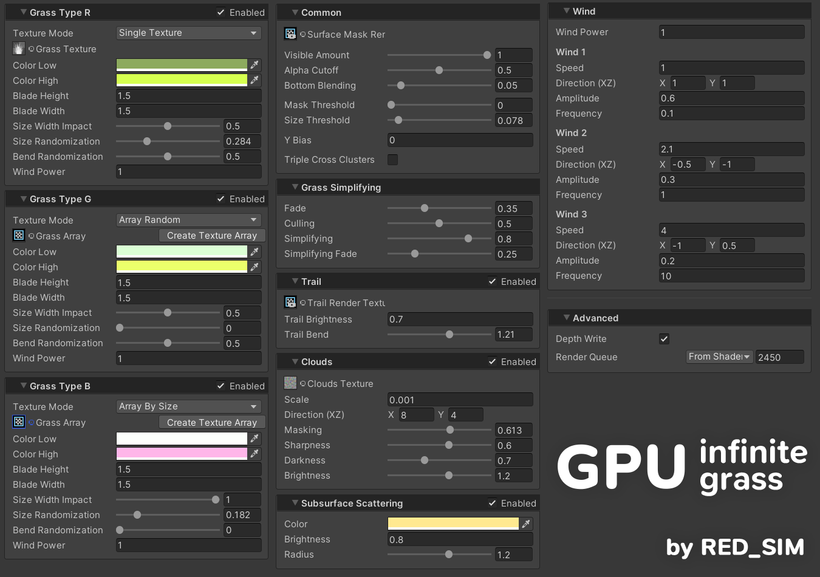 How does a GPU-instanced grass system work in Unity? GPU Infinite Grass by RED_SIM is a system designed to render large-scale grass using GPU instancing.