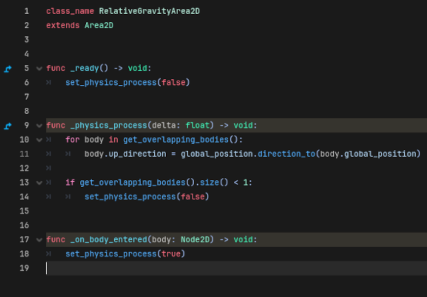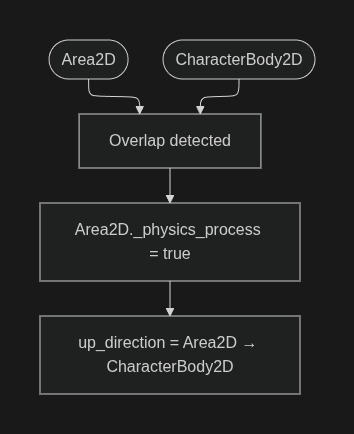 The system uses Area2D nodes to define gravity zones. When a CharacterBody2D enters the area, the gravity field begins updating that character’s up_direction every frame. When no bodies remain inside the area, the physics process is turned off to avoid unnecessary updates.