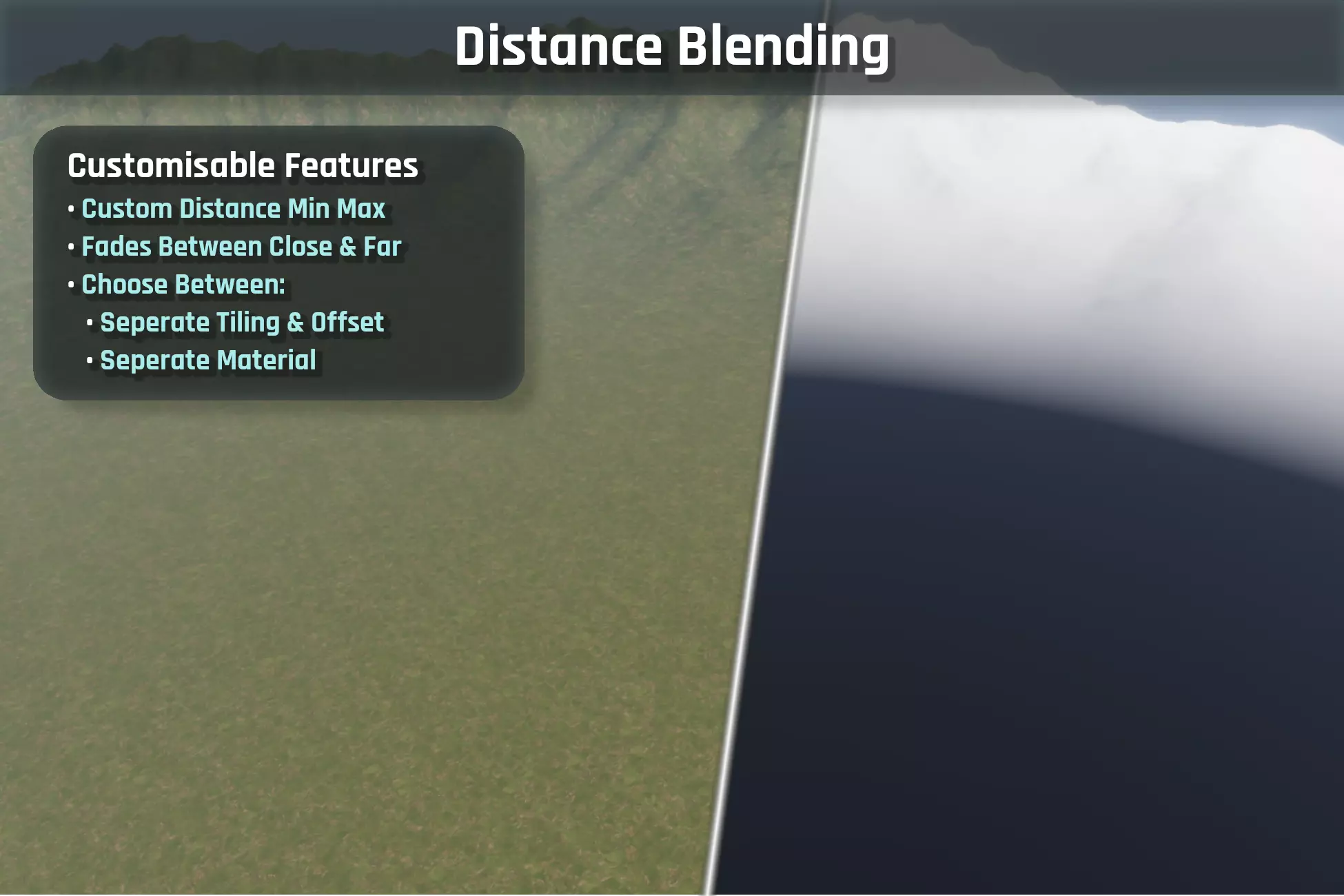 Another part of the system is distance blending, which allows materials or tiling values to change depending on how far the surface is from the camera. This helps reduce repetition over large areas without affecting close-up detail.