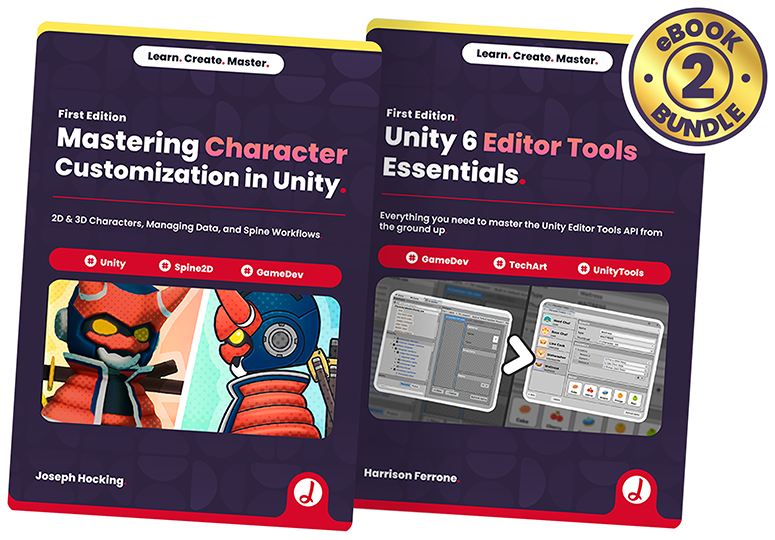 Take your Unity 6 skills to the next level with this essential bundle! Get two comprehensive guides covering the most in-demand skills for today’s Unity 6 projects: streamline your workflow with professional editor scripting and productivity tools in Unity Editor Tools Essentials, and dive deep into character systems and dynamic customization with Mastering Character Customization in Unity. Whether you want to boost productivity or give players total creative freedom, this bundle delivers the skills and confidence to succeed with Unity 6.